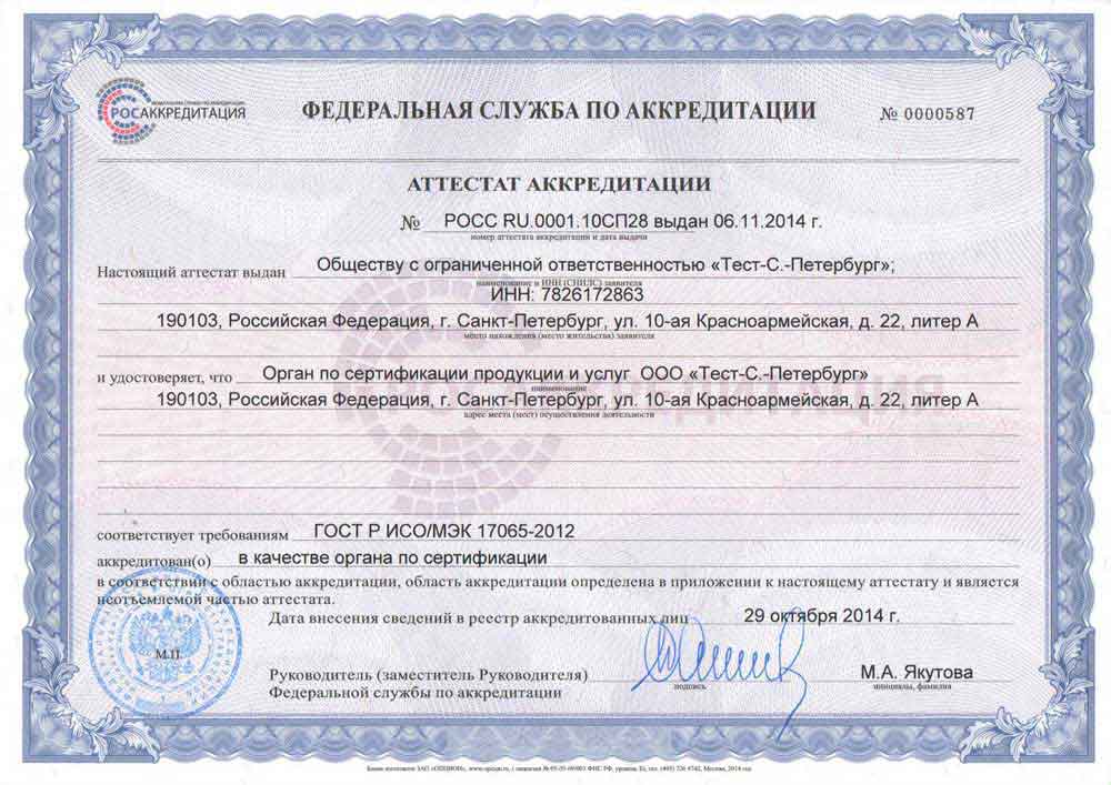Независимость, компетентность, объективность и беспристрастность Органа по сертификации ООО «Тест-С.-Петербург» подтверждается национальной и международной аккредитацией, а также 30 -летним успешным опытом работы на рынке сертификации. Аккредитация: