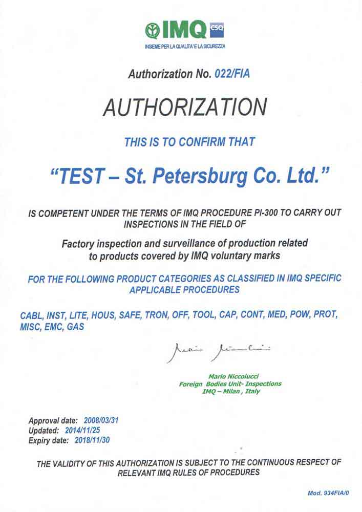 Орган по сертификации продукции и услуг ООО «Тест-С.-Петербург»: Аккредитован Национальным органом Российской Федерации по аккредитации — Федеральной службой по аккредитации (Росаккредитация) на право проведения работ по подтверждению соответствия продукции и услуг в утвержденной области аккредитации (Аттестат аккредитации № РОСС RU.0001.10СП28 от 29 октября 2014 г.) Уполномочен Институтом испытаний и сертификации VDE (Германия) на проведение инспекций заводов и предприятий (Сертификат об уполномочивании от 17.11.2014г.) Уполномочен Итальянским институтом гарантии качества продукции IMQ на проведение фабричных инспекций и надзора за производством (Решение об уполномочивании № 022/FIA от 25.11.2014 г.) «Орган по сертификации систем менеджмента ООО «Тест-С.-Петербург»: Аккредитован Национальным органом Российской Федерации по аккредитации — Федеральной службой по аккредитации (Росаккредитация) на право проведения работ по сертификации систем менеджмента в утвержденной области аккредитации (Аттестат аккредитации № РОСС.RU.0001.13СК03). Аккредитован Индийским национальным органом по аккредитации — Национальным советом по аккредитации органов по сертификации (NABCB) – членом Международного форума по аккредитации (IAF) на право проведения работ по сертификации: